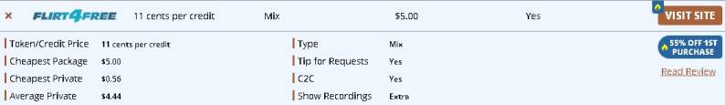 | Site | Privé le moins cher | Moyenne privée | Spectacles gratuits alimentés par des pourboires | Chat gratuit C2C | Enregistrable privé |
