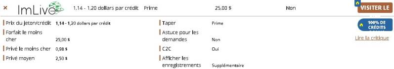 | ImLive | 0,98 $ | 2,50 $ | Oui | Non | Coût supplémentaire | Non |